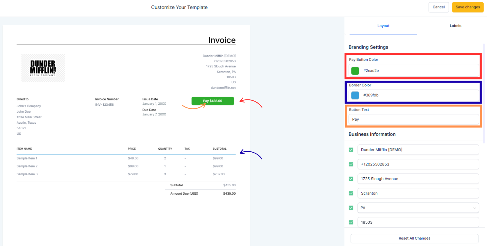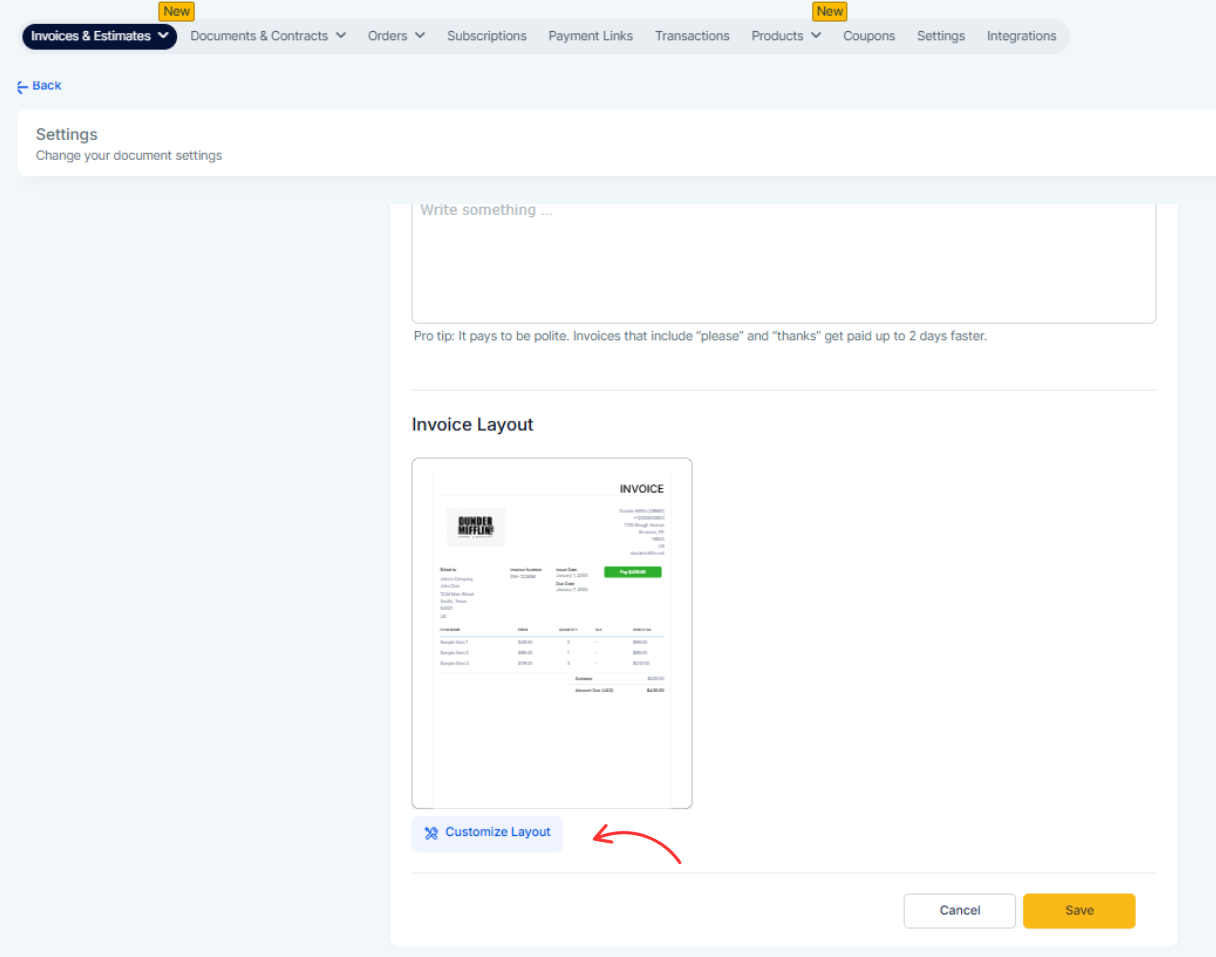 Layout changes apply to new invoices. Sent invoices keep their original layout.