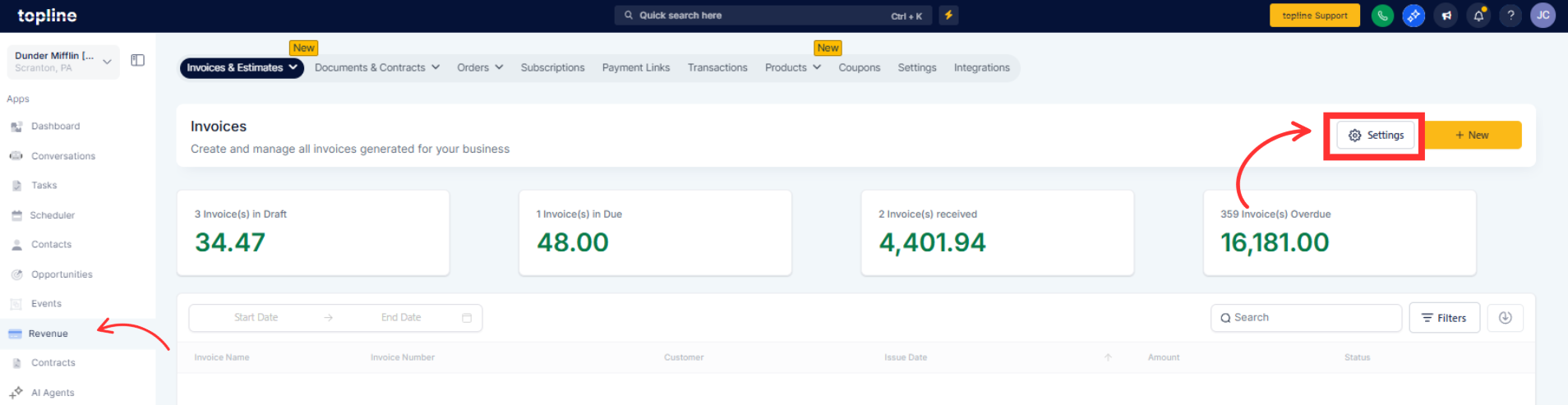 Open Revenue and go to Invoices, then open Settings and Layouts.