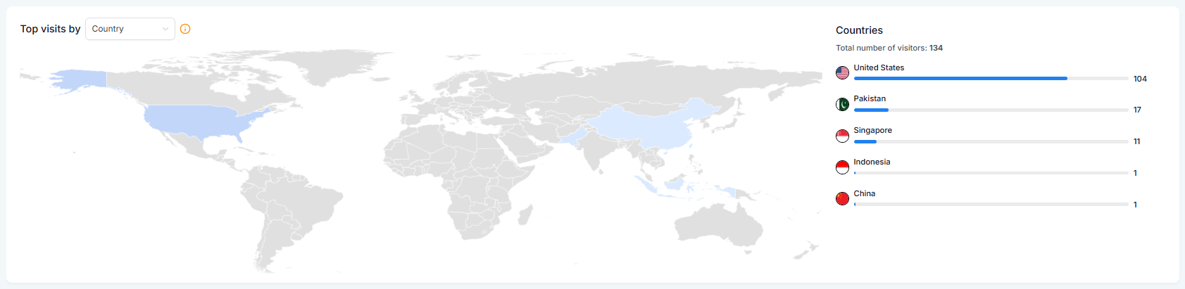 Open Sites > Analytics and scroll down to the Geography or Locations section. Choose a date range and apply filters such as channel, campaign, or tags.