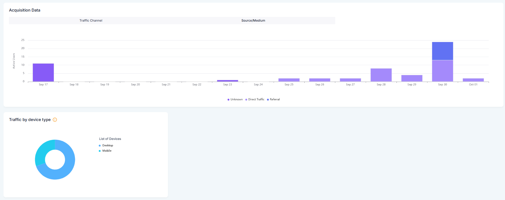 Unified dashboard that groups results by traffic source, for example, Organic, Paid, Social, Email, Referral, and Direct