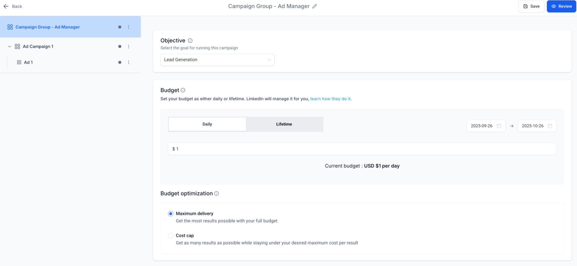 Click Connect and authenticate with LinkedIn. Choose the ad account and Page you want to manage. Import existing campaigns or click Create to build a new campaign. Set objective, audience, budget, and schedule.