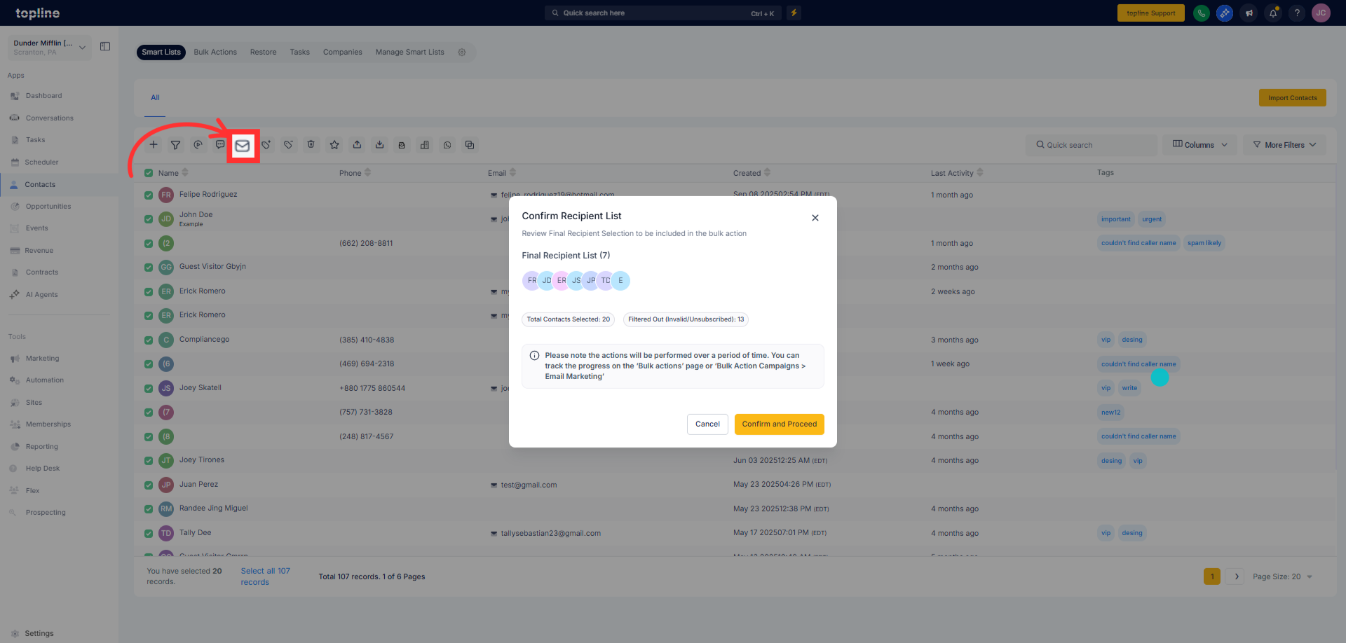 Topline OS refreshes the bulk email creation experience inside Contacts. Select recipients, pick a template or write from scratch, personalize with merge fields, preview on desktop/mobile, and schedule or send—all in a streamlined UI with clearer deliverability warnings and unsubscribe/compliance safeguards.