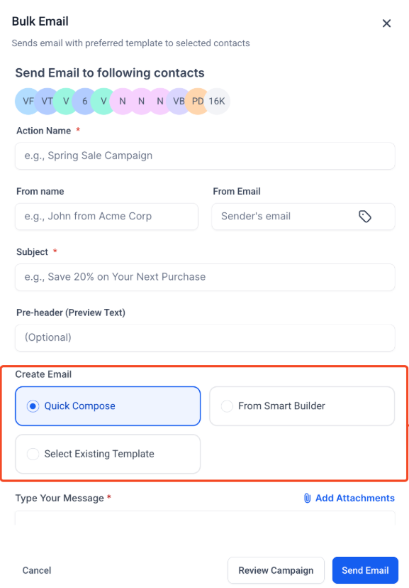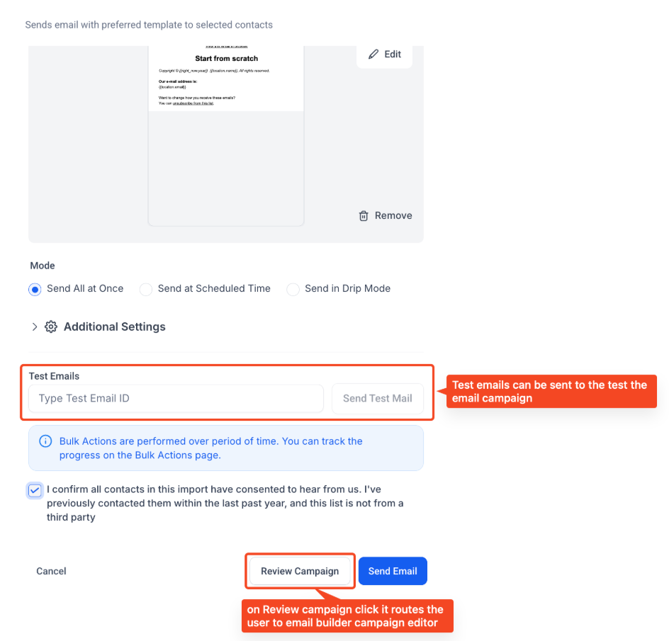 Choose a template or start from scratch. Add subject, from/sender profile, and content.
