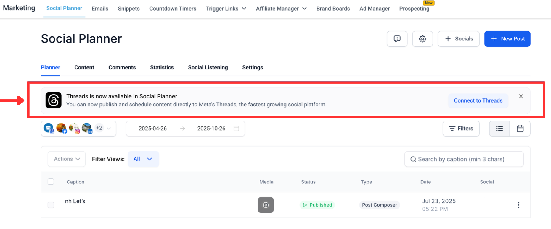 Go to Marketing → Social Planner → Settings → Connect and choose Threads. Authenticate with your Meta/Threads account and grant requested permissions. Select the Threads profile to manage.