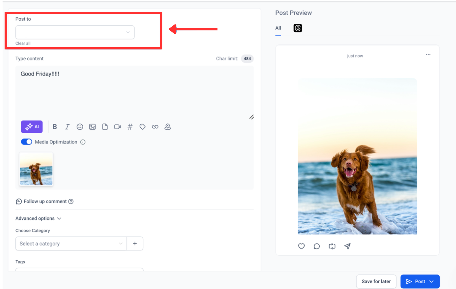 Open Social Planner → Create post. Choose Threads as the channel (and optionally select additional channels if cross-posting).