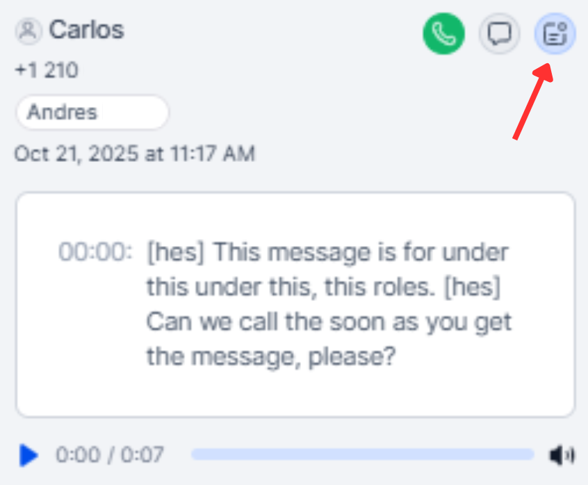 Click a voicemail to open playback and transcription. Use quick actions to call back, send a text, assign an owner, or add tags.