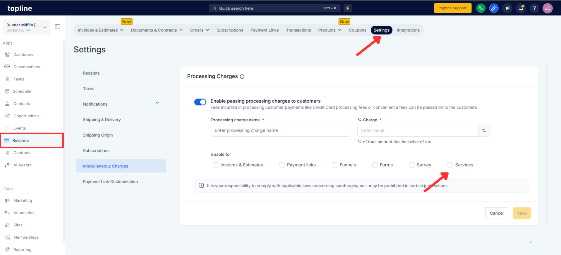 Open Revenue, then click on Settings and turn on Taxes and Processing fees for services.