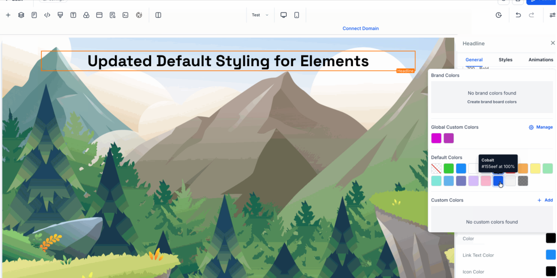 The Page Builder now ships with modern default styling for common elements. Headings, text, buttons, forms, containers, and media render with consistent spacing, accessible contrast, and responsive presets. New pages and newly added elements look great immediately, while legacy content can opt in through a guided update.