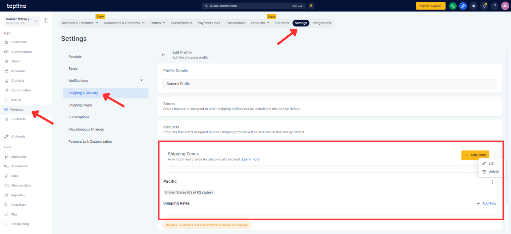 Open Revenue, click on Settings, and go to Shipping & Delivery. Add the Zone or edit it