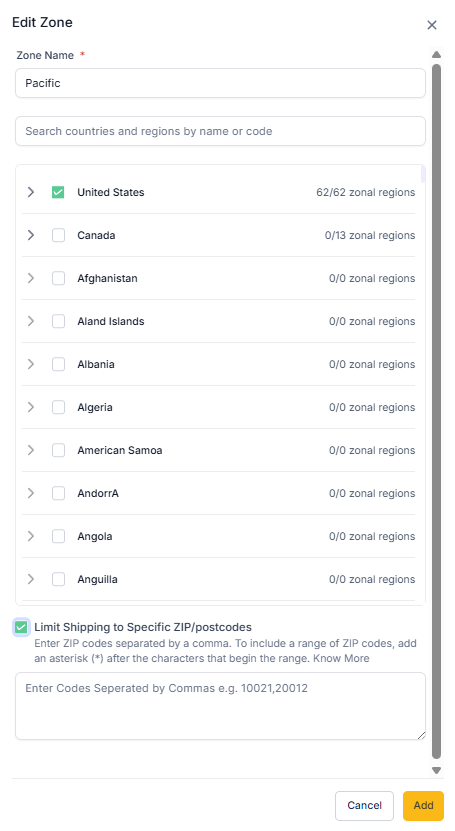 Shipping settings now include zip code-based filters. Create zones using lists or ranges of zip codes, combine them with country and state rules, and assign methods and rates that apply only to those areas. This improves delivery accuracy, supports local delivery or pickup rules, and reduces failed checkouts from addresses that are not supported.