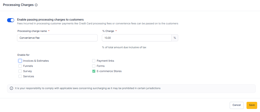 Create a new Processing Fee and choose Fixed or Percentage. Set amount, optional minimum and maximum caps, and tax treatment. Add rules for when the fee applies, such as payment method, product tags, or order thresholds.