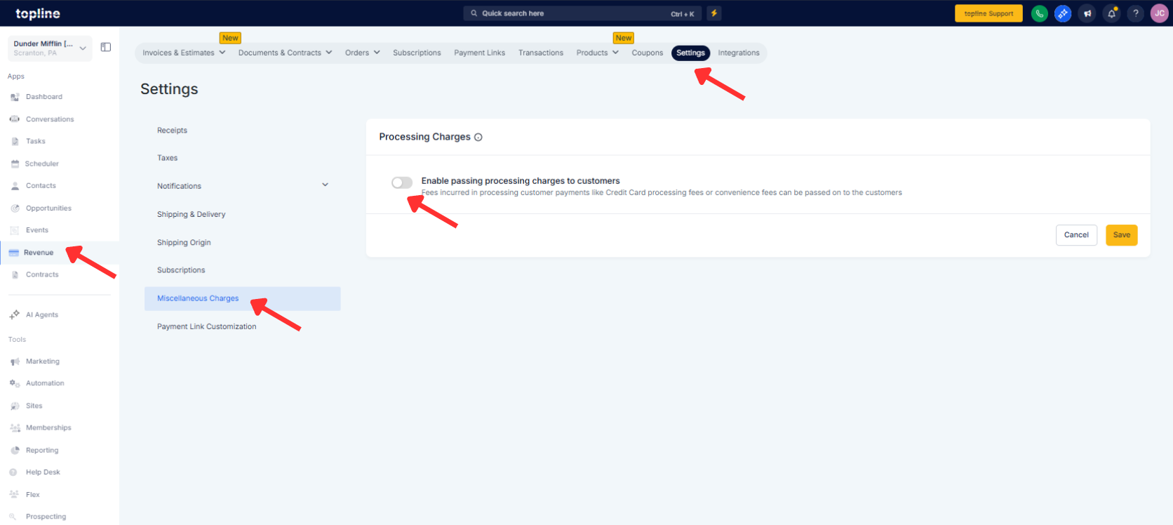 Open Revenue, then click on Settings, and proceed to Miscellaneous Charges. Then activate the Processing Charges.