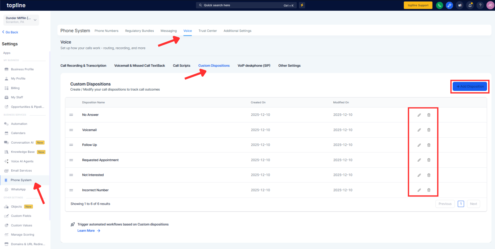 Open Settings, then Phone System, then Voicemail, and select Call Dispositions. Add or edit up to ten clear outcomes that fit your process.