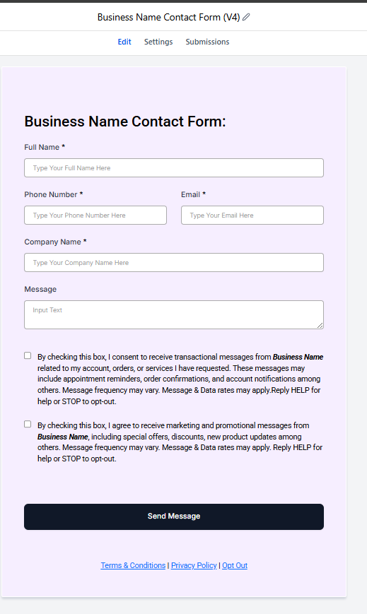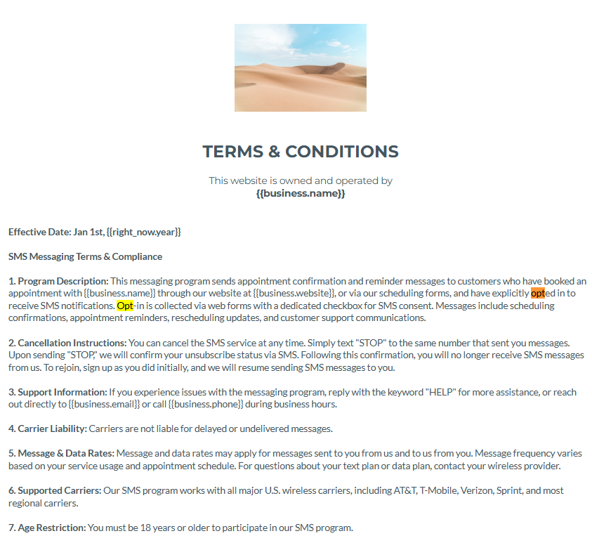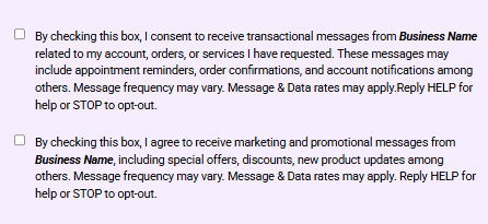 “By checking this box, you agree to receive text messages from [Brand Name] related to [Program Type: appointment reminders / support updates / offers]. Message frequency varies. Message and data rates may apply. Reply STOP to opt out. Reply HELP for help. View our Terms and Privacy Policy.”