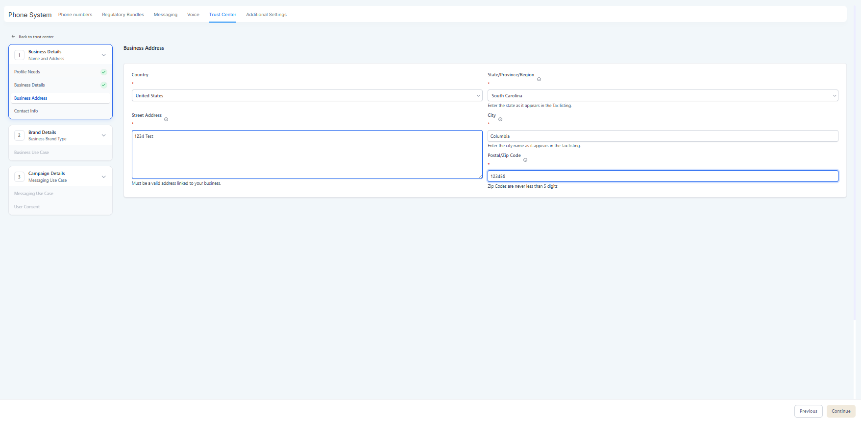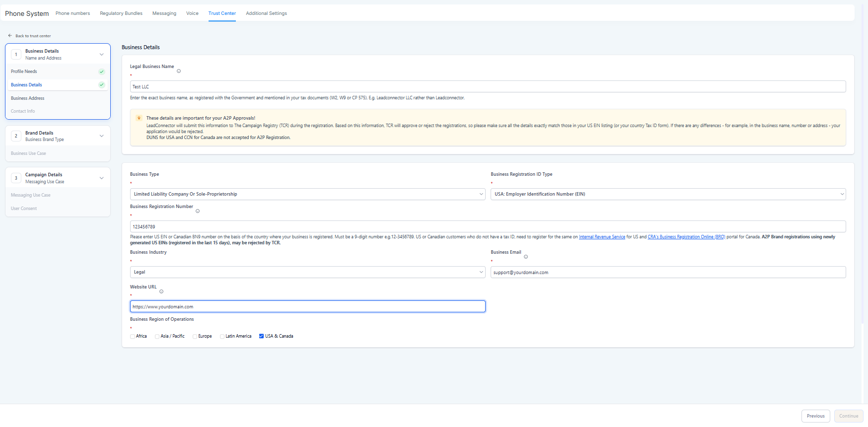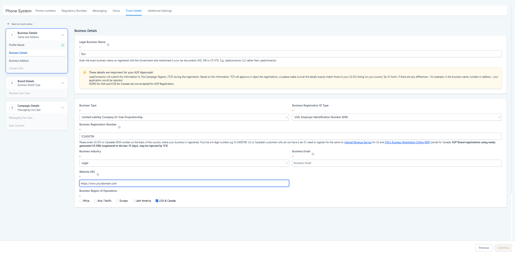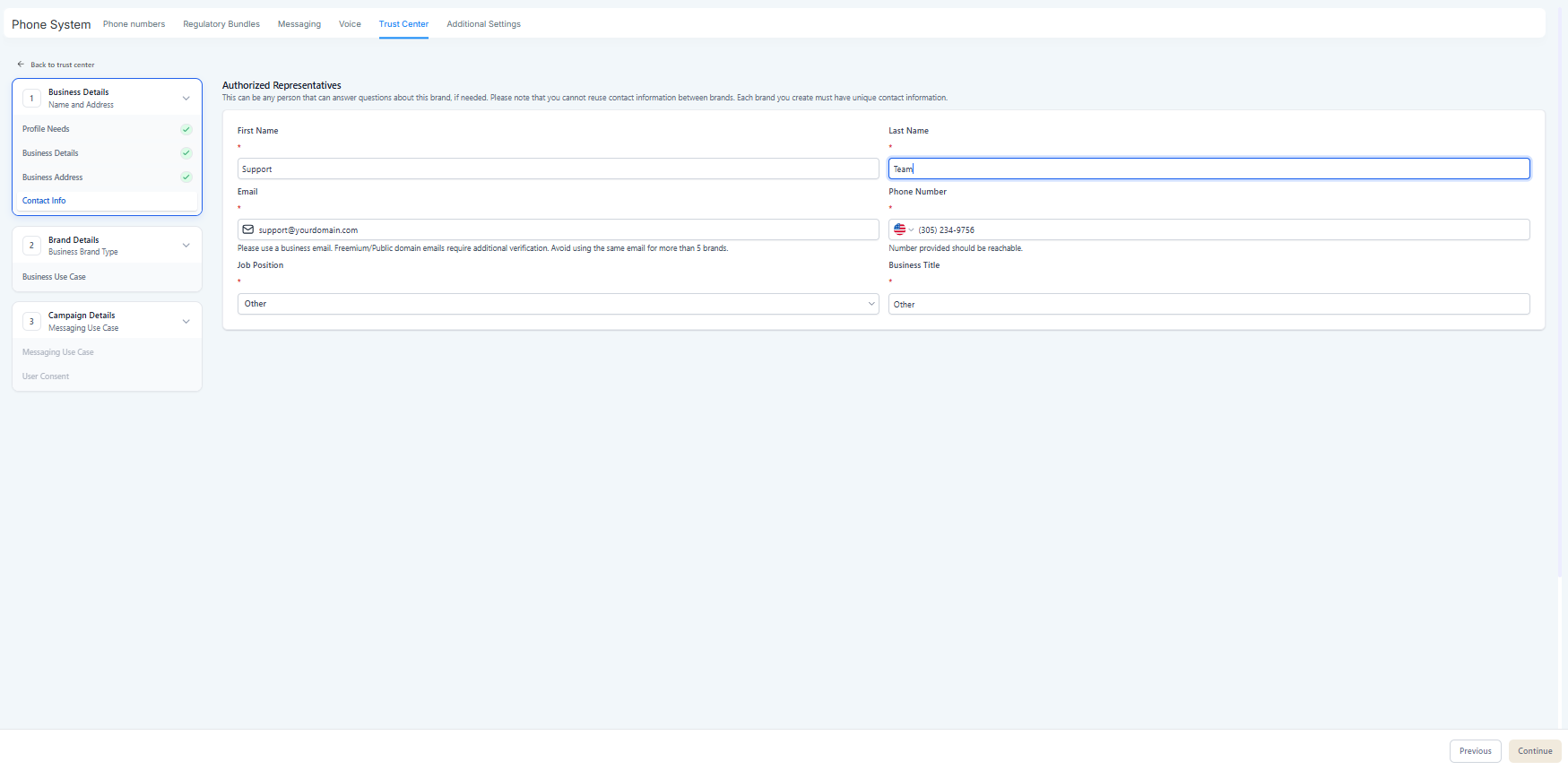 If Brand is incorrect → you may get rejected or a low Trust Score (lower throughput, more carrier scrutiny).