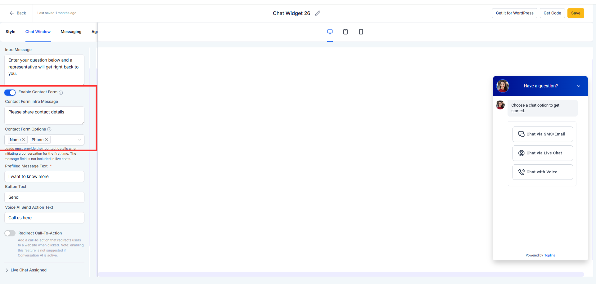 You can now edit the text displayed before and after a visitor submits the contact form in the chat widget. This helps set expectations guide users through the process and reinforce next steps once their message is sent.