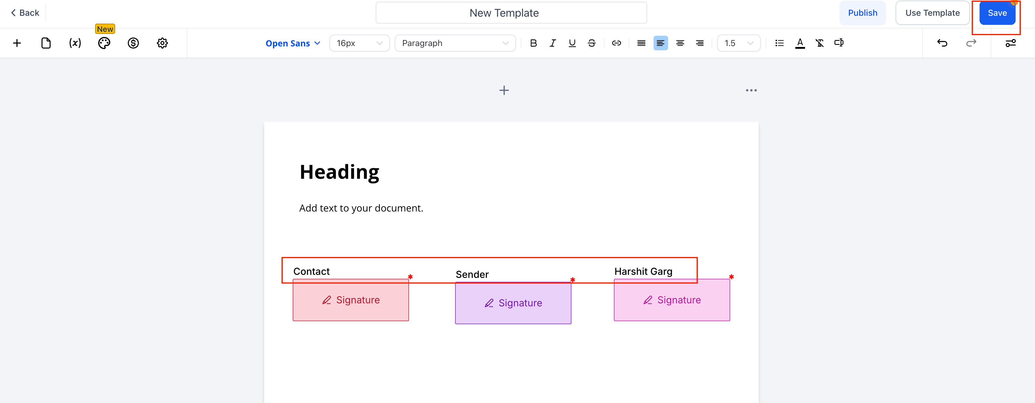 Click New and open the template editor. Add a Signature or any other fillable field. Set “To be signed by” > Sender.