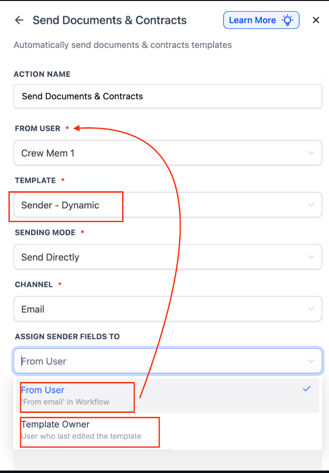 Enable dynamic assignment for fillable fields within the action. Choose how each fillable field is assigned using contact or user data.