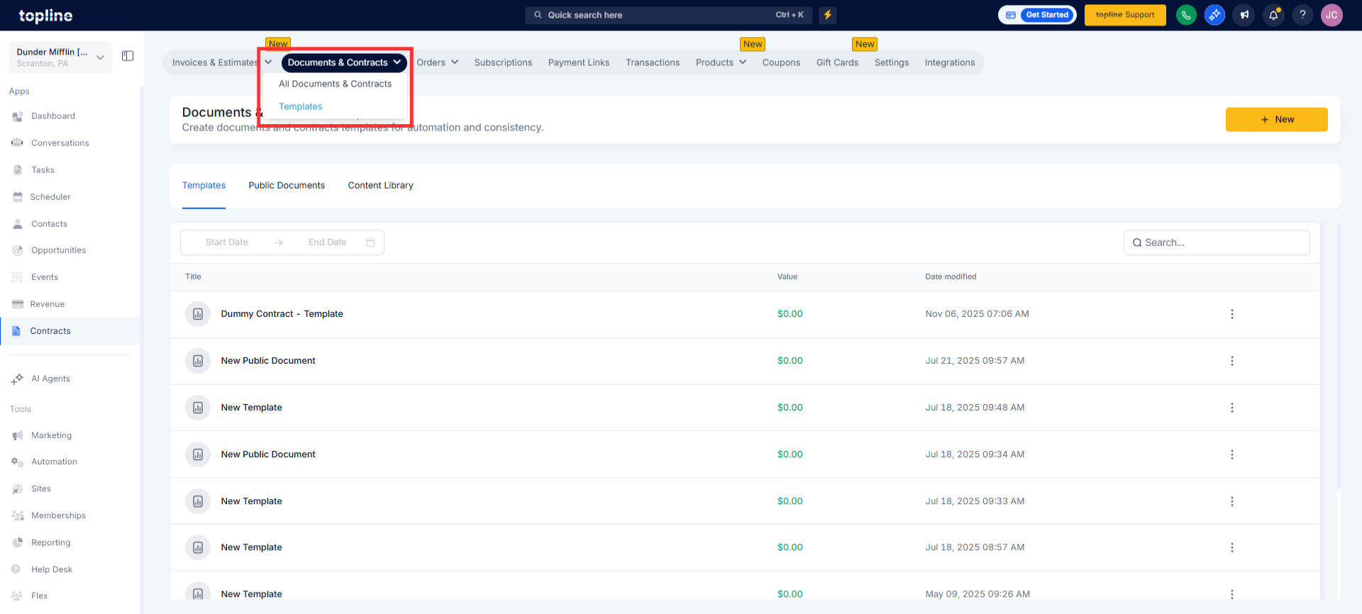 Navigate to your Documents & Contracts section and open an existing or new document.