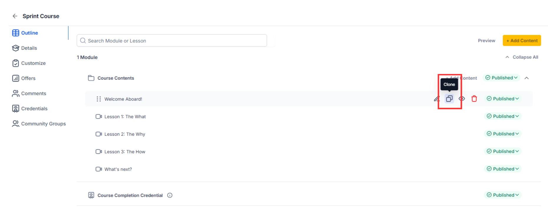 Find the lesson or section you want to duplicate. Choose the clone action from the content options menu.