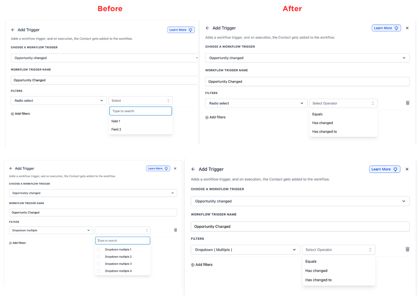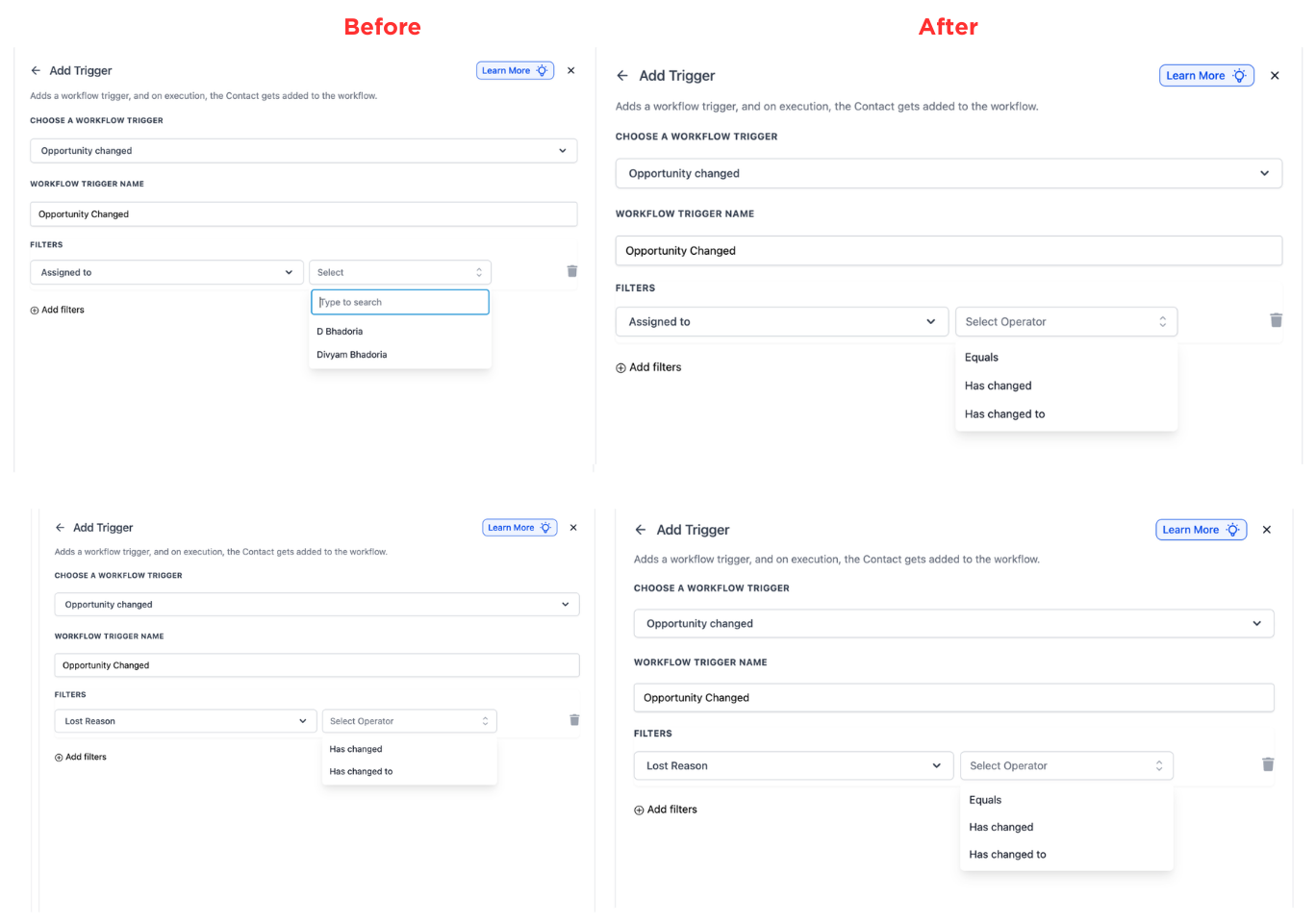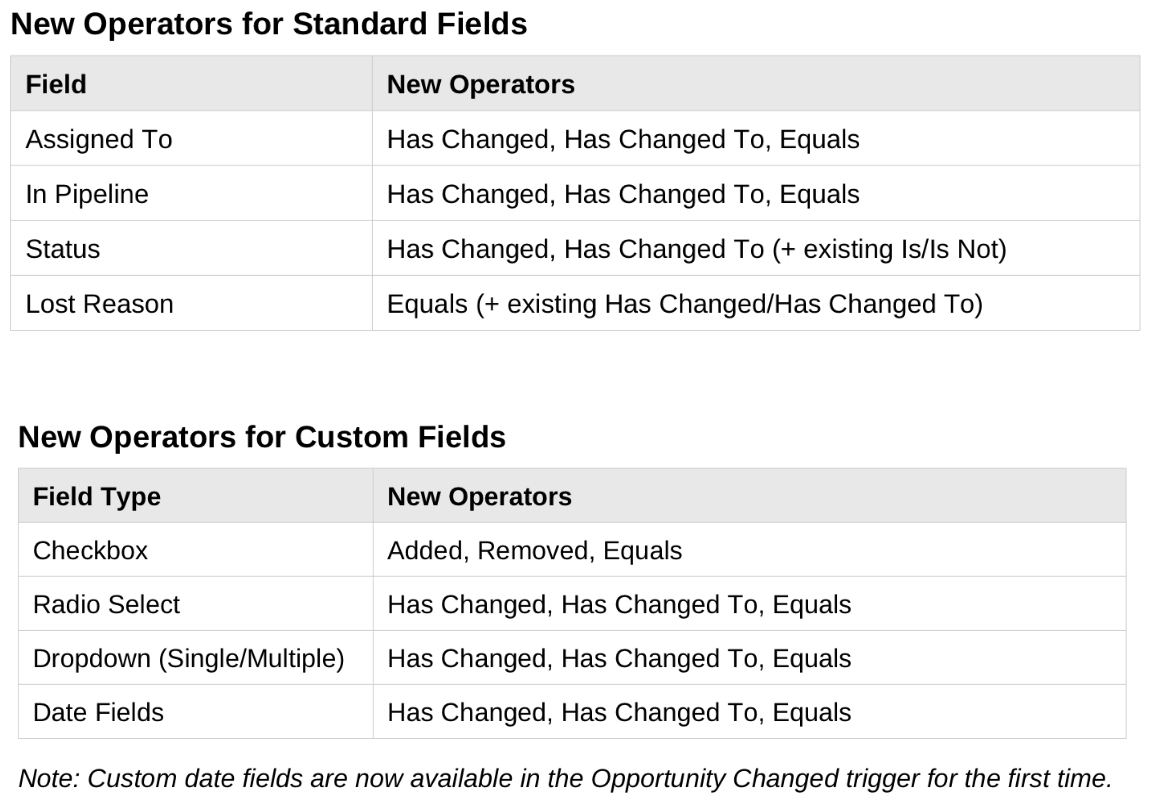 The opportunity changed trigger now provides improved detection and handling of updates. This allows workflows to respond more reliably when opportunity details change, resulting in better timing cleaner automation logic and fewer unintended executions.