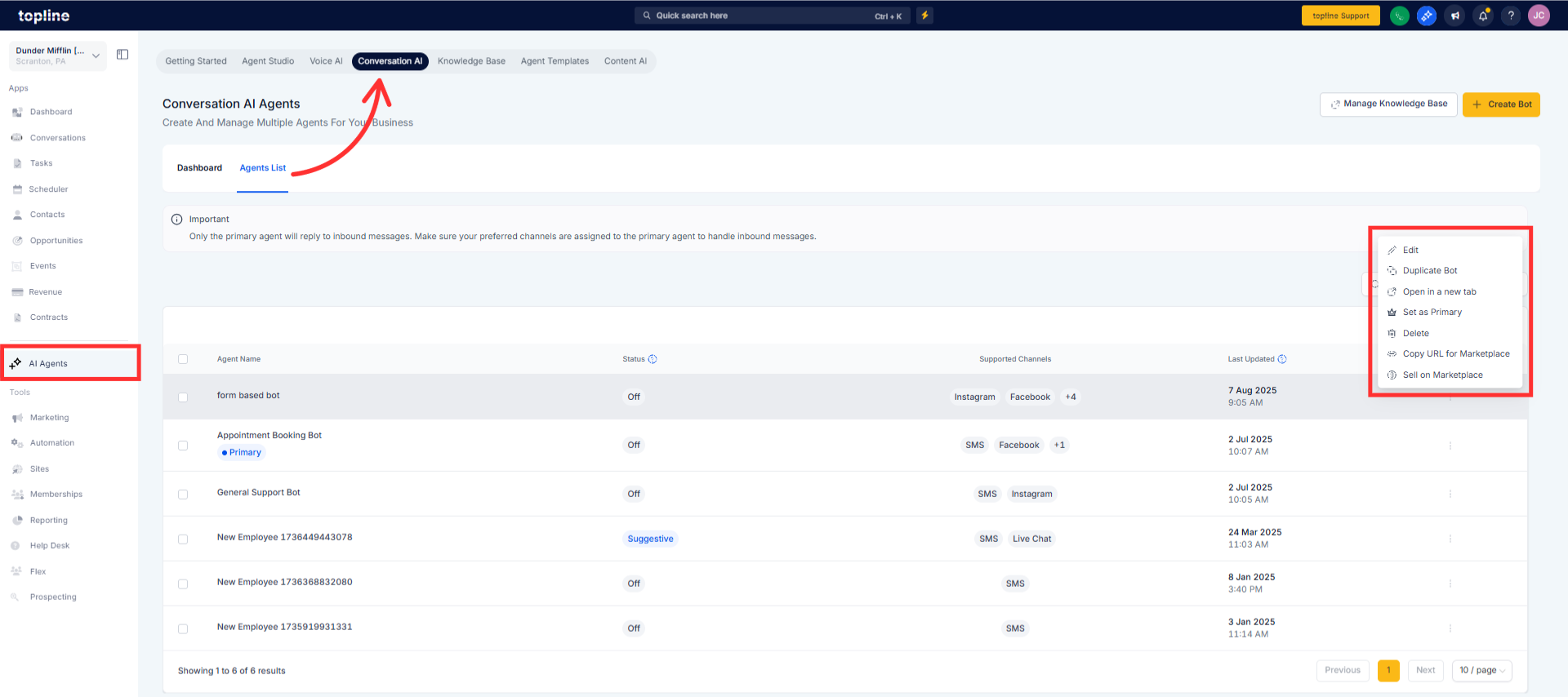 Navigate to the area where bot conversations are managed.