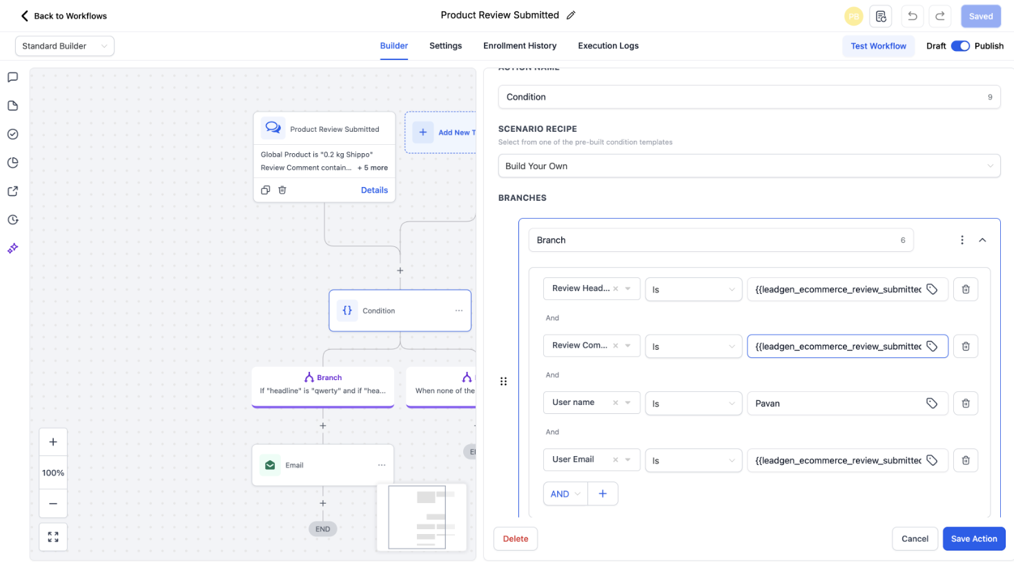 You can now automatically respond when a product review is submitted in an e-commerce store. This trigger helps you acknowledge feedback, request additional review, manage reputation, and drive post-purchase engagement without manual effort.