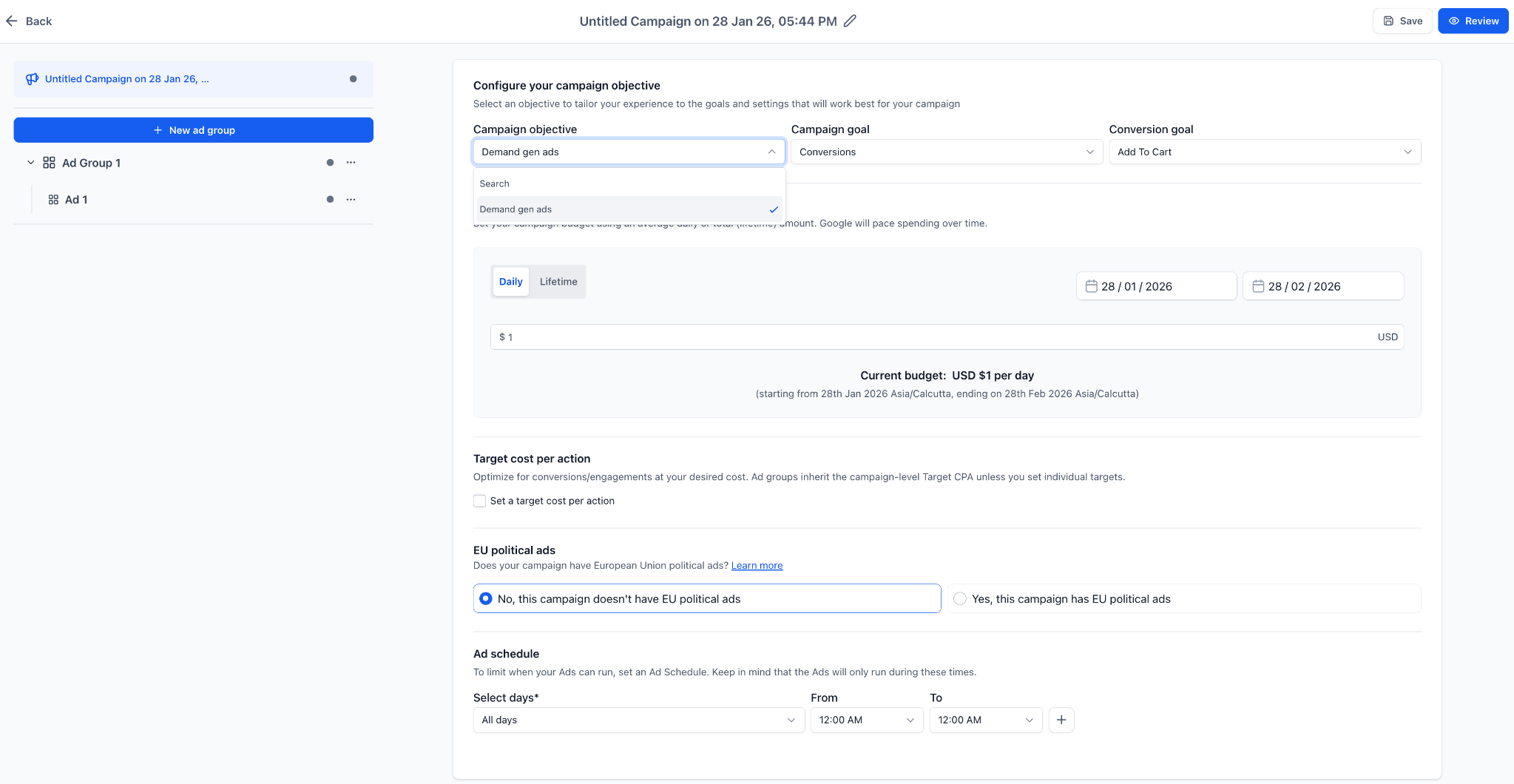 Select Google Demand Gen as the campaign type. Set a budget targeting creatives and audience details.