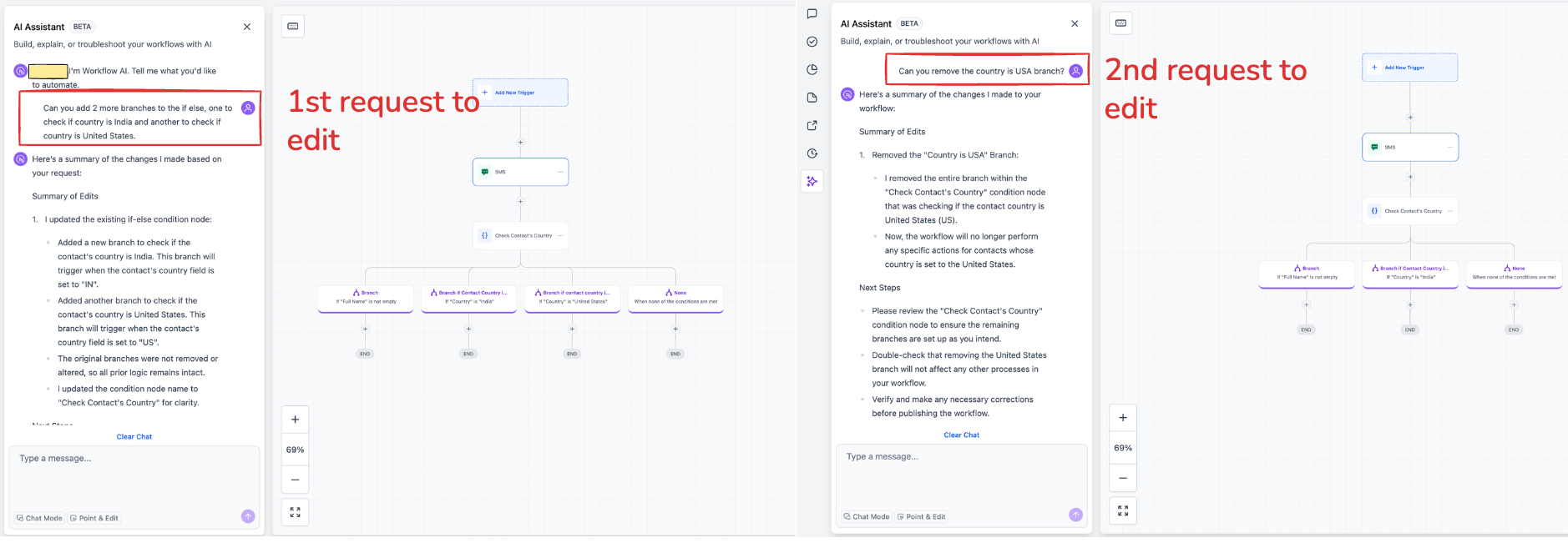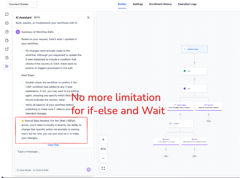 You can now modify if-else and wait actions inside the AI builder using conversational instructions. Instead of manually reconfiguring each step, describe the change you want, and the AI builder will update the workflow logic accordingly, saving time and improving efficiency.