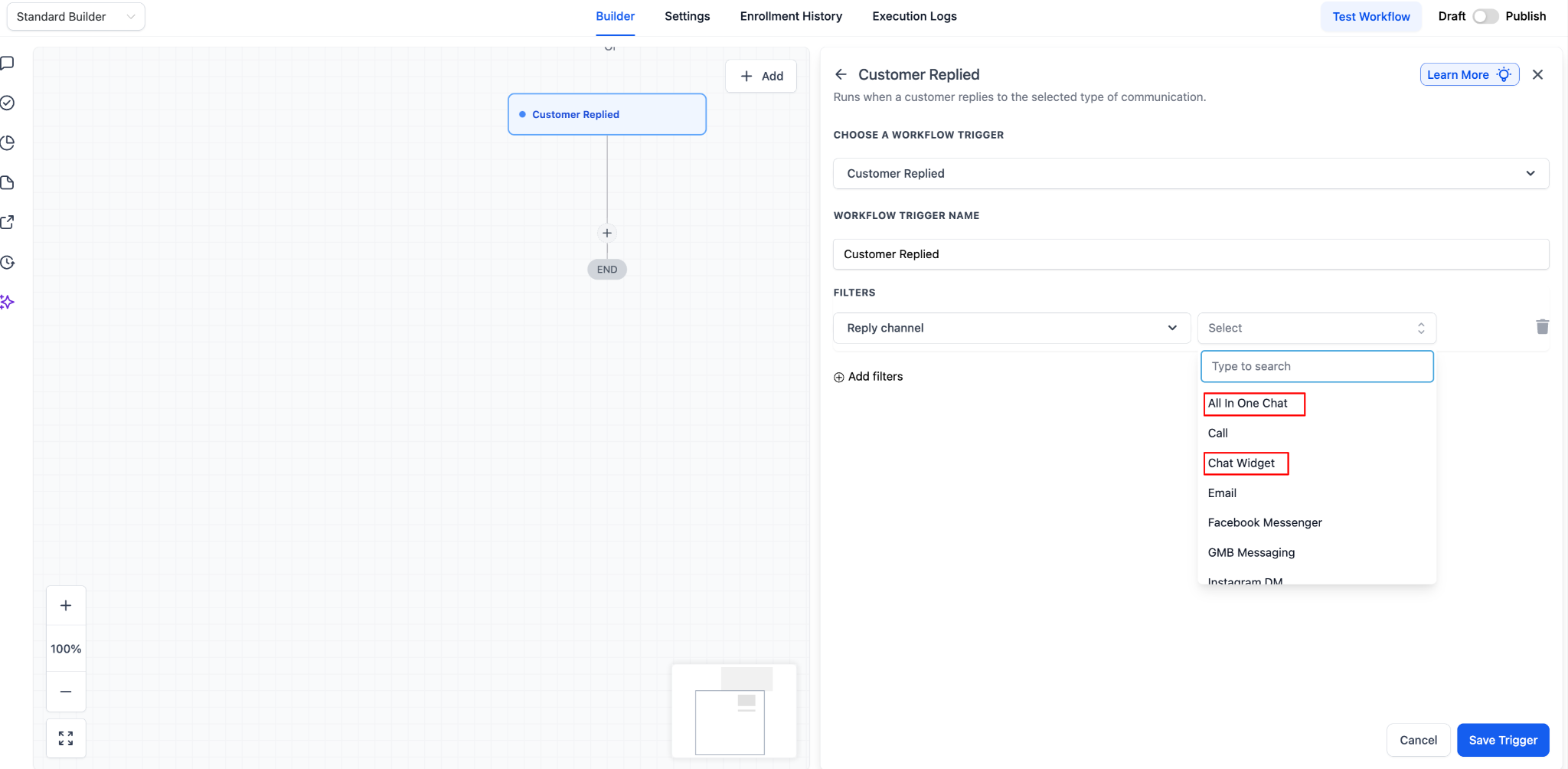 Choose the customer replied trigger as the workflow entry point.