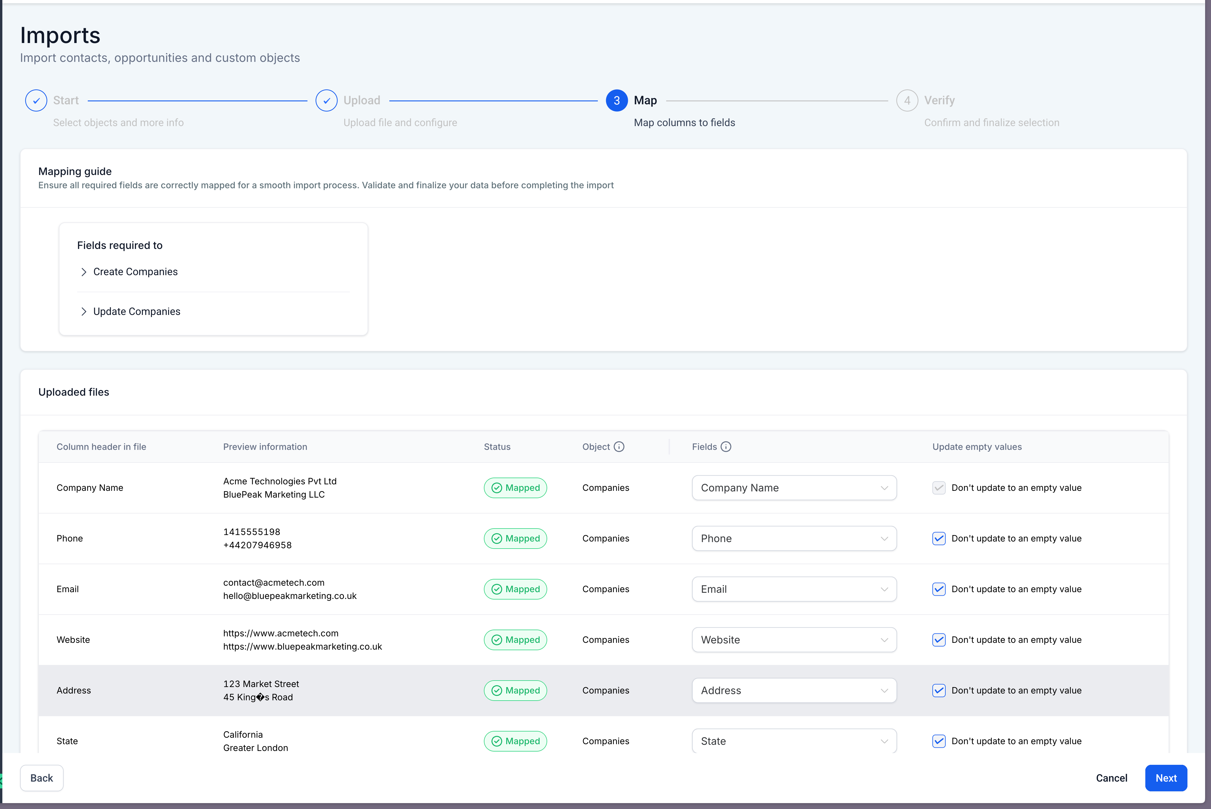 Match file columns to the appropriate company fields.