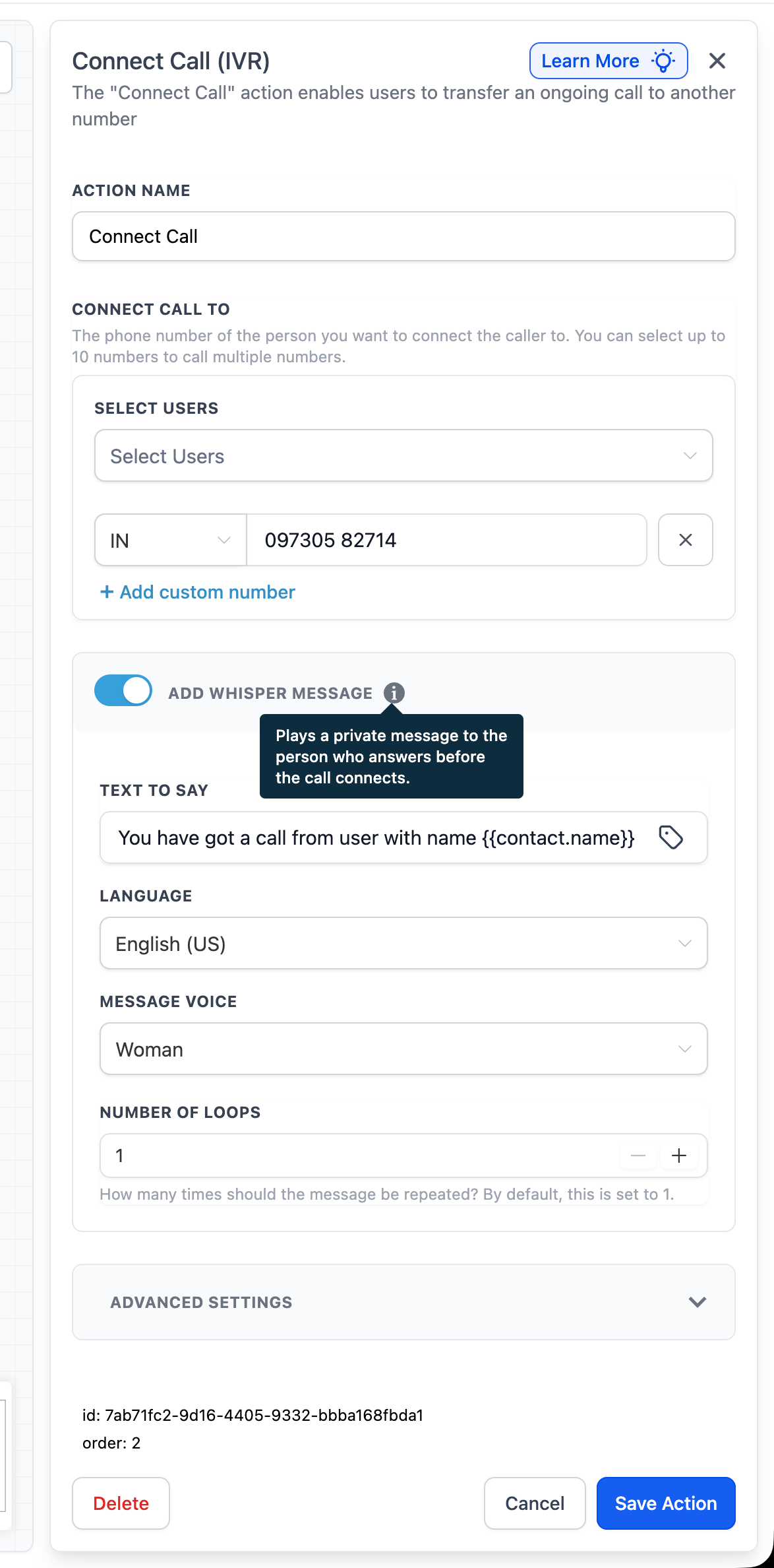 The connect call IVR action now includes call whisper functionality. This feature plays a short message to the receiving agent before the call connects, giving context about the caller and improving call preparation for better conversations.