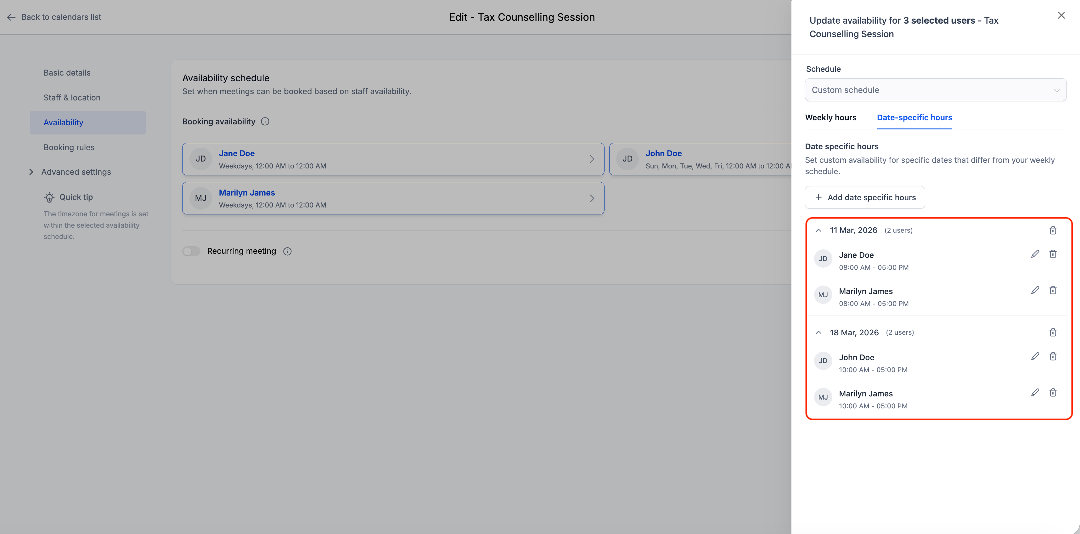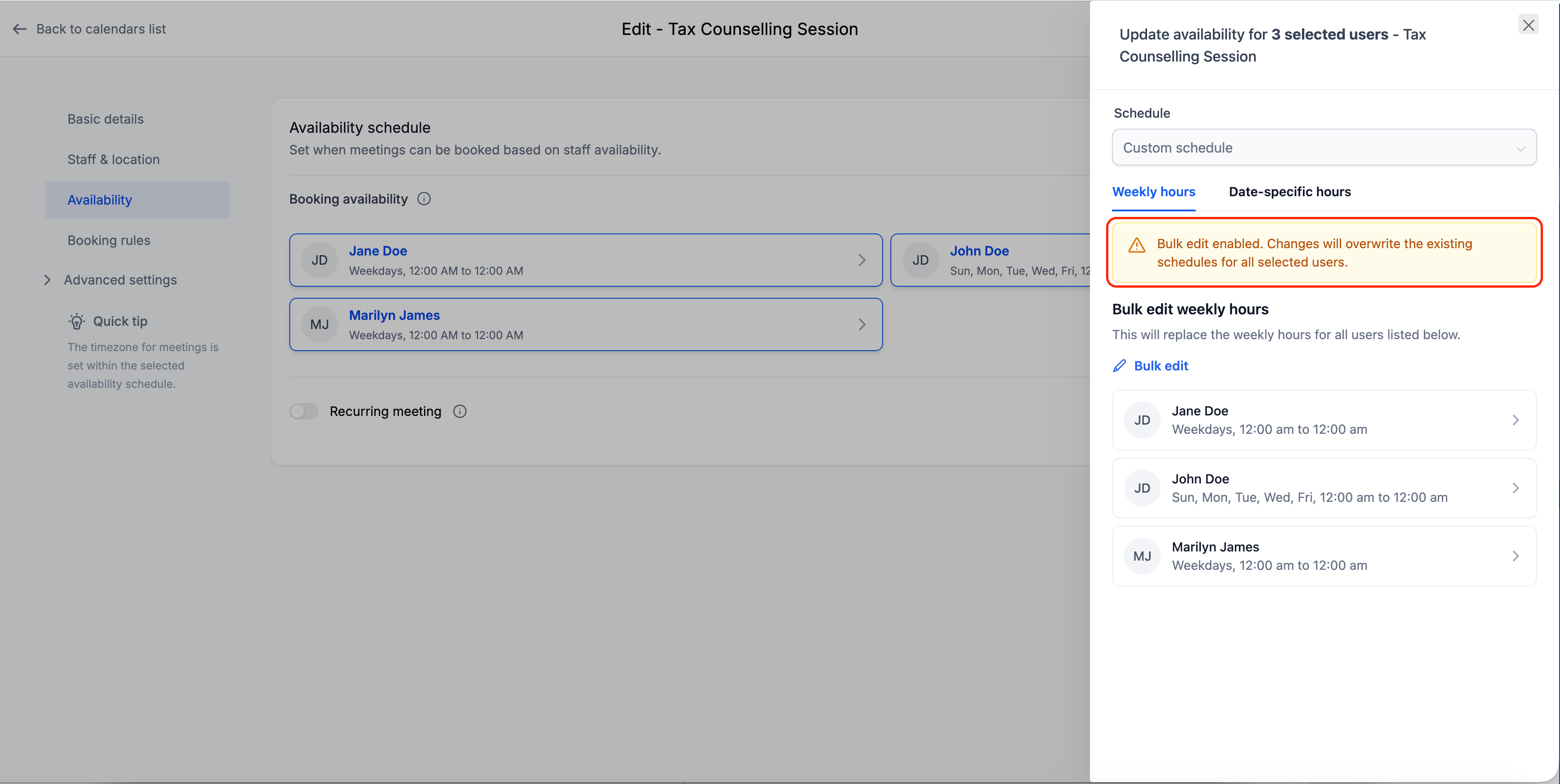 You can now edit schedules in bulk within multi-user calendars. This improvement allows administrators to quickly update availability rules across several users without editing each calendar individually, saving time and improving scheduling consistency.